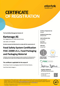 Kartonage AS er sertifisert iht FSSC 22000 og produserer kartongemballasje i ren sone med tilhørende rutiner for renhold og slusing av råvarer og ferdigvarer.